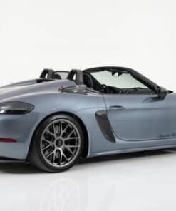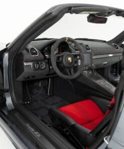THIS… is a 2024 Porsche 718 Boxster Spyder RS Weissach, finished in Vanadium Grey Metallic with a black soft top and a black and Carmine Red interior.
